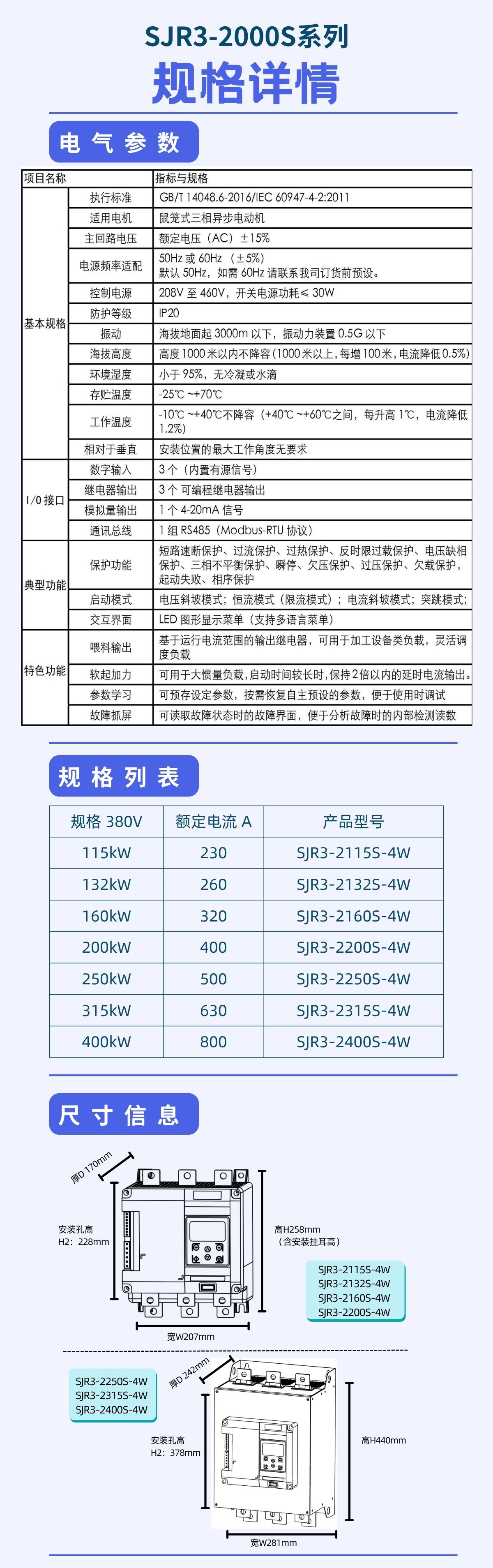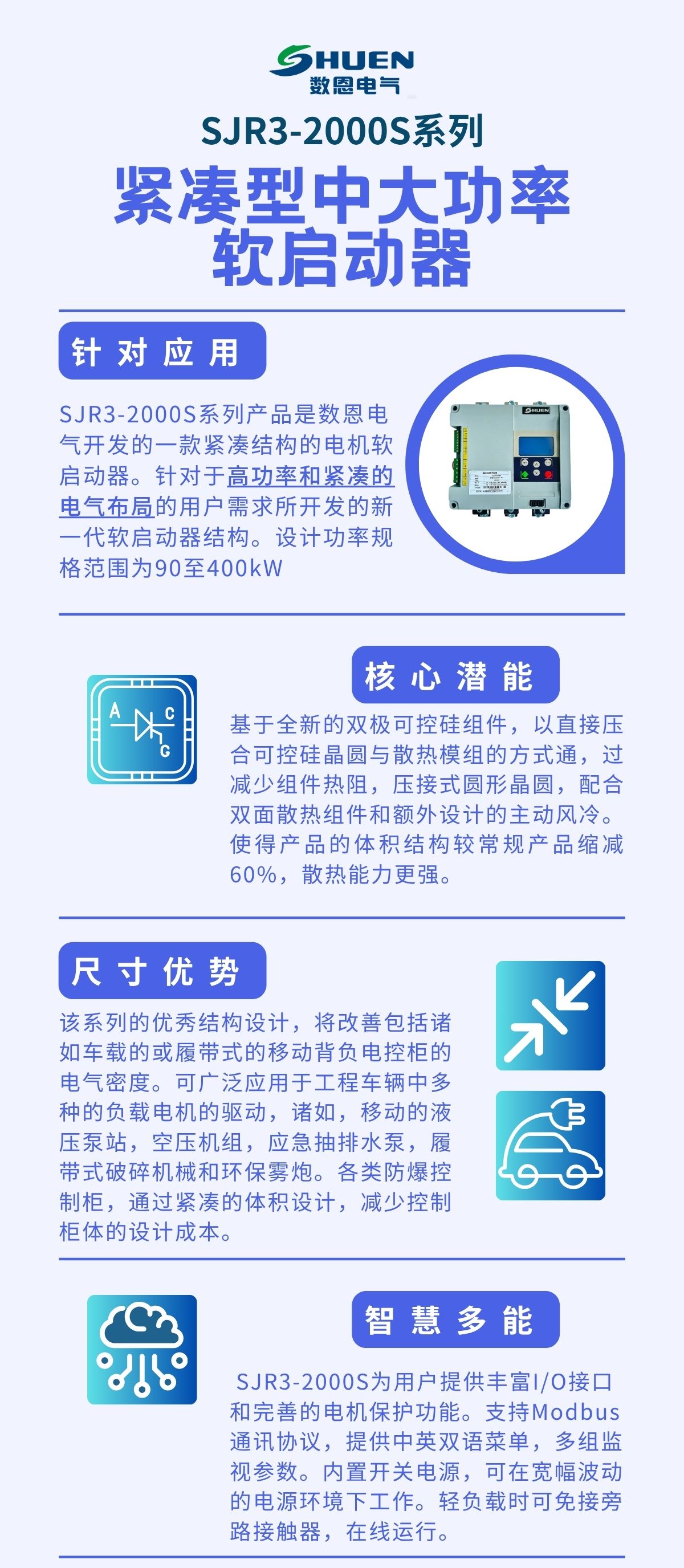 SJR3-2000S是CQ9传奇电子公司最新研发的超紧凑软启动器,针对紧凑的车载(履带式)电柜 / 防爆电箱 / 壁挂基业箱 提出高密度电气解决方案,兼容在线式应用的同时兼备有外置旁路连接方式,增加了欠载,运行次数,运行时间,线性的温度监控等多种功能,内置集成了RS485通讯总线,提供多语种菜单。